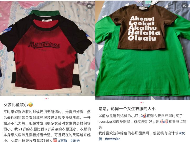 有网友拿出了自己成人的上衣跟6岁弟弟的上衣相比,直呼还不如6岁童装尺寸大,图二更让人哭笑不得,同样都是女装一件oversize跟修身版比较确认差距很大。