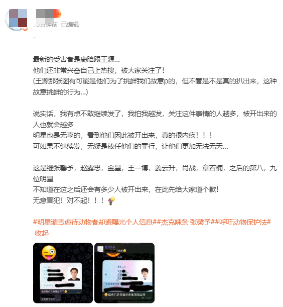 “继他们预告之后,又有三位男明星被他们非法扒出了个人信息!!!最可怕的是,如果那么多人的关注都无法制止他们的恶行,那下一个被开的极有可能就是我们认识的任何一个明星,甚至就是为此事发声的你我他!这不是虐猫,也不是什么无关紧要的事情,而是每一个普通无辜人都有可能被卷进的漩涡!”