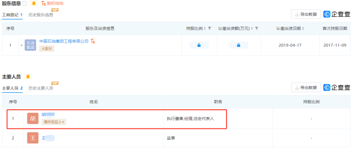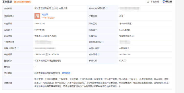 橙柿互动记者搜索爱企查和企查查系统显示,寰球工程项目管理(北京)有限公司成立于1995年,是一家以从事专业技术服务业为主的企业。企业注册资本3000万人民币,公司的法人代表为胡某勇。该公司是中国石油集团工程有限公司的全资子公司。