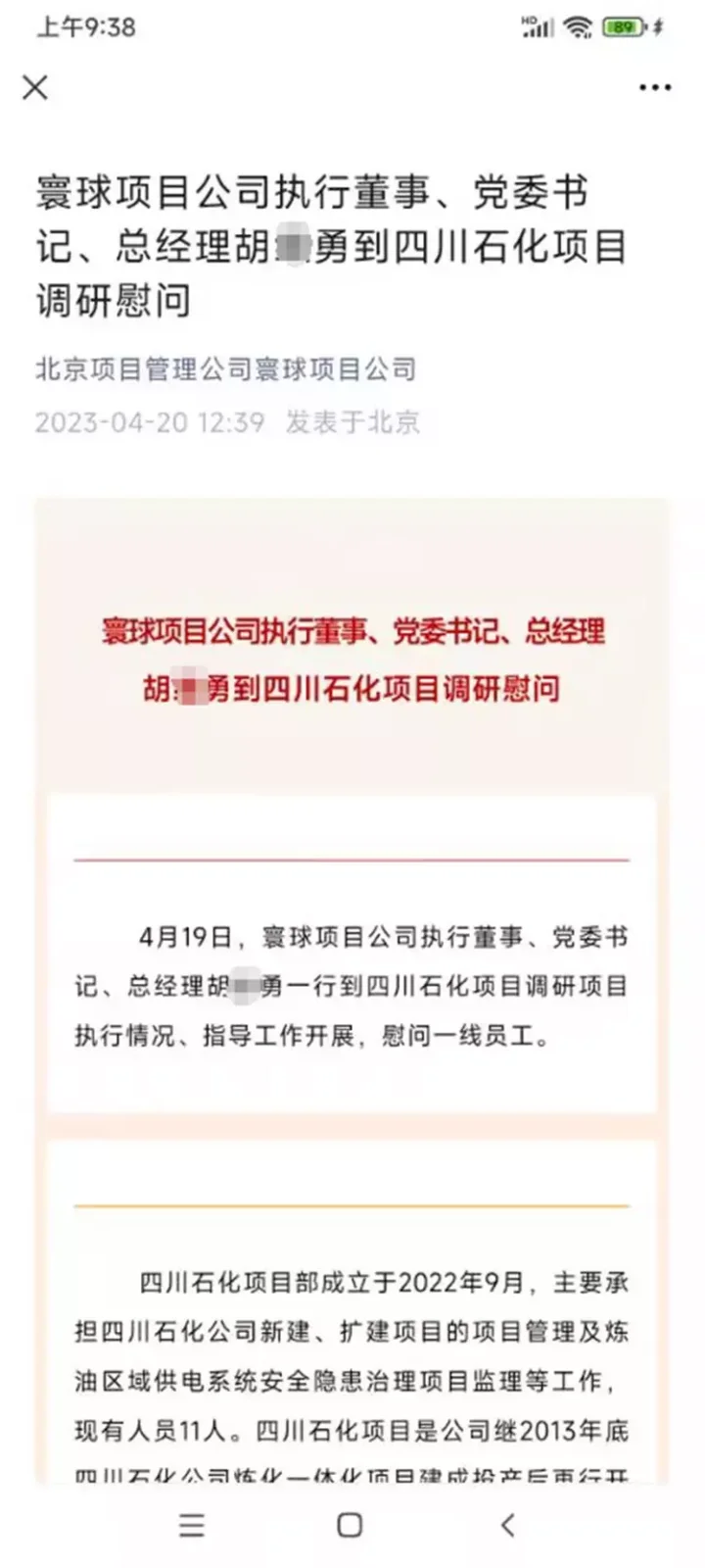 该公司此前发布过的关于胡某勇的相关微信,4月20日,公司官微发布一则关于胡某勇在四川石化调研慰问的微信文章。
