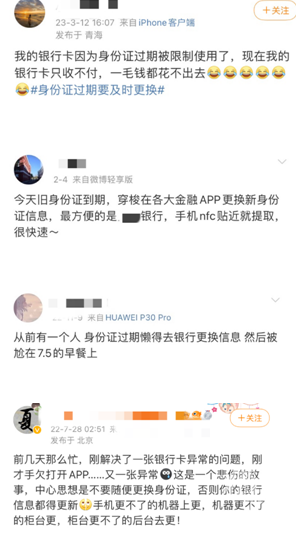 “今天旧身份证到期,穿梭在各大金融APP更换新的身份证信息。”也有网友热心地分享了自己的经验,并提到某股份制银行的APP很方便,手机NFC贴近就可快速提取身份证信息。