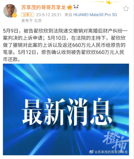 5月12日晚,@苏享茂的哥哥苏享龙称,被告翟欣欣撤销了对其中一起相关民事案件判决的上诉申请,原告家属于12日确认收到翟欣欣的660万元还款。