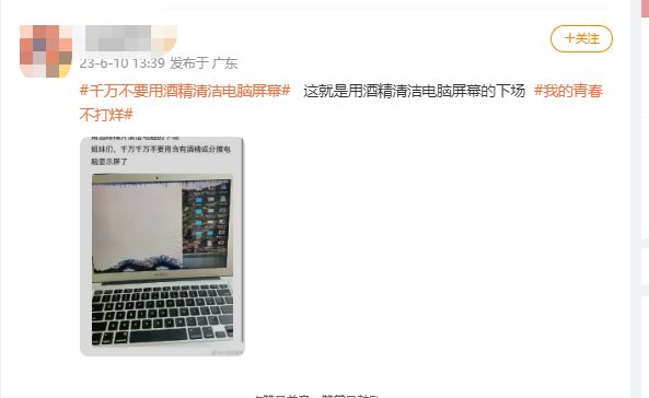 有网友发博,自己用酒精清洁电脑后,屏幕废了……