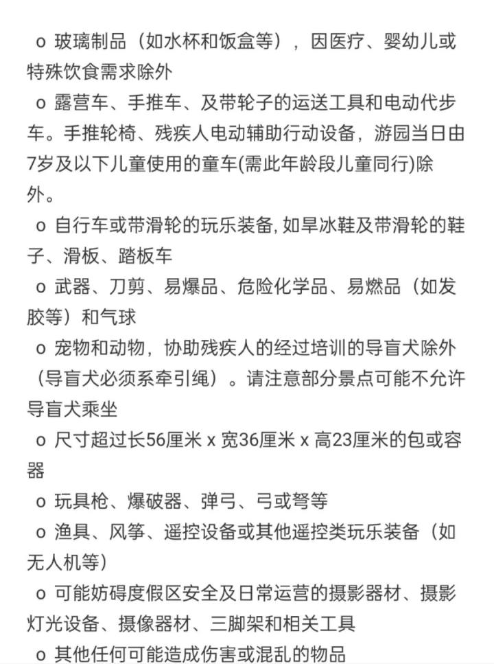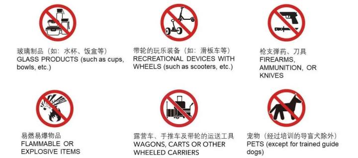 入园须知中提到,基于安全考虑,武器、刀剪、易爆品、危险化学品、易燃品(如发胶等)、气球、玩具枪、爆破器、弹弓、弓或弩等物品被禁止进入北京环球度假区。