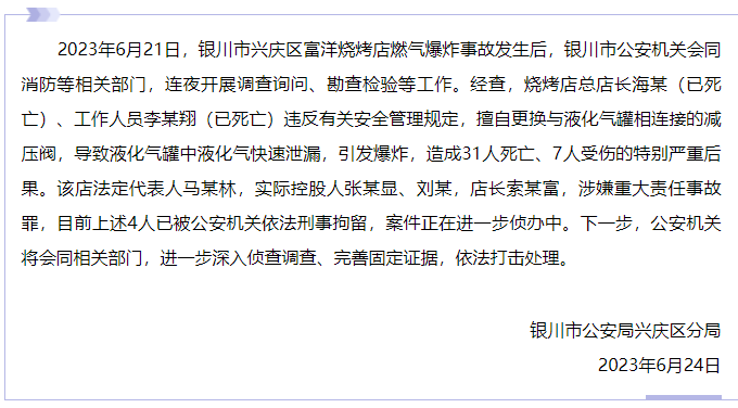 2023年6月21日,银川市兴庆区富洋烧烤店燃气爆炸事故发生后,银川市公安机关会同消防等相关部门,连夜开展调查询问、勘查检验等工作。经查,烧烤店总店长海某(已死亡)、工作人员李某翔(已死亡)违反有关安全管理规定,擅自更换与液化气罐相连接的减压阀,导致液化气罐中液化气快速泄漏,引发爆炸,造成31人死亡、7人受伤的特别严重后果。该店法定代表人马某林,实际控股人张某显、刘某,店长索某富,涉嫌重大责任事故罪,目前上述4人已被公安机关依法刑事拘留,案件正在进一步侦办中。下一步,公安机关将会同相关部门,进一步深入侦查调查、完善固定证据,依法打击处理。