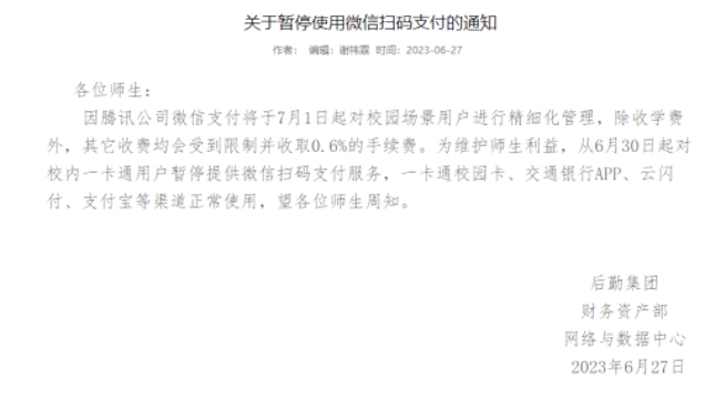 西北大学发布的公告称,“因腾讯公司微信支付将于7月1日起对校园场景用户进行精细化管理,除收学费外,其它收费均会受到限制并收取0.6%的手续费。为维护师生利益,从6月30日起对校内一卡通用户暂停提供微信扫码支付服务,一卡通校园卡、交通银行App、云闪付、支付宝等渠道正常使用,望各位师生周知。”