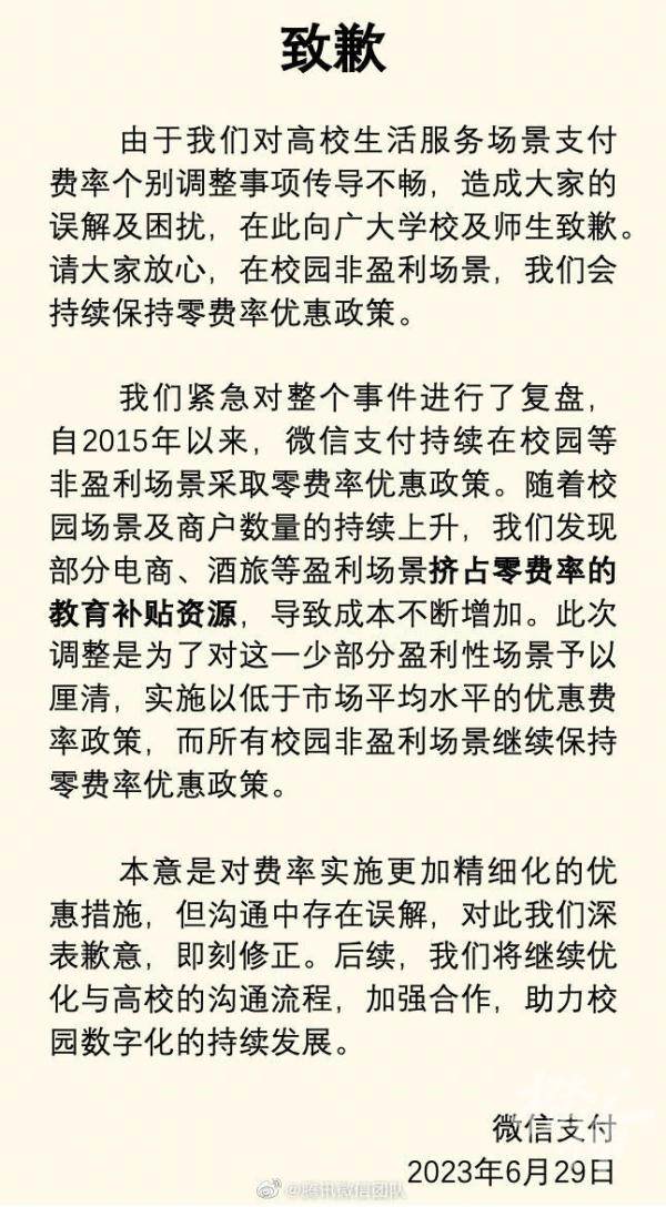 都市快报讯 今天一天,“多所高校停用微信支付”的消息在热搜上挂了许久。下午,腾讯微信团队紧急发布致歉信,强调“在校园非盈利场景,我们会持续保持零费率优惠政策。”