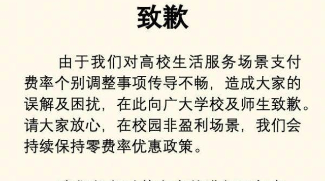 但在后续多个渠道的传播中,“微信支付对高校收费”成了关键词,特别是在一些简讯里,“除收学费外”未被提及,导致许多人第一时间的反应是,微信支付怎么连学生的钱都不放过?这也是为什么,在致歉信里,微信特别强调了,将持续在校园非盈利场景采取“零费率”,只针对电商、酒旅等盈利场景调整费率,而且是低于市场平均水平的优惠费率。