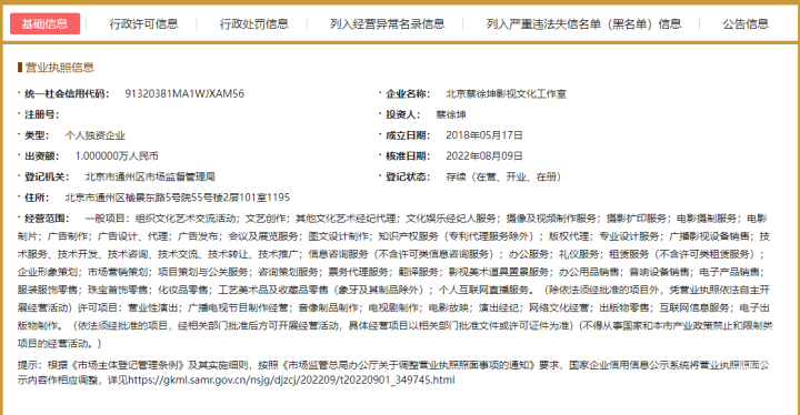 公开信息显示,北京蔡徐坤影视文化工作室的投资人为蔡徐坤,类型属于个人独资企业,企业成立时间为2018年5月17日。经营范围包括组织文化艺术交流活动、文艺创作、文化娱乐经纪人服务、摄像及视频制作服务、电影摄制服务、电影制片等。