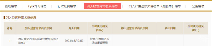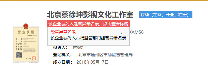 橙柿互动消息 记者从国家企业信用信息公示系统了解到,6月28日,北京蔡徐坤影视文化工作室被列入经营异常名录。