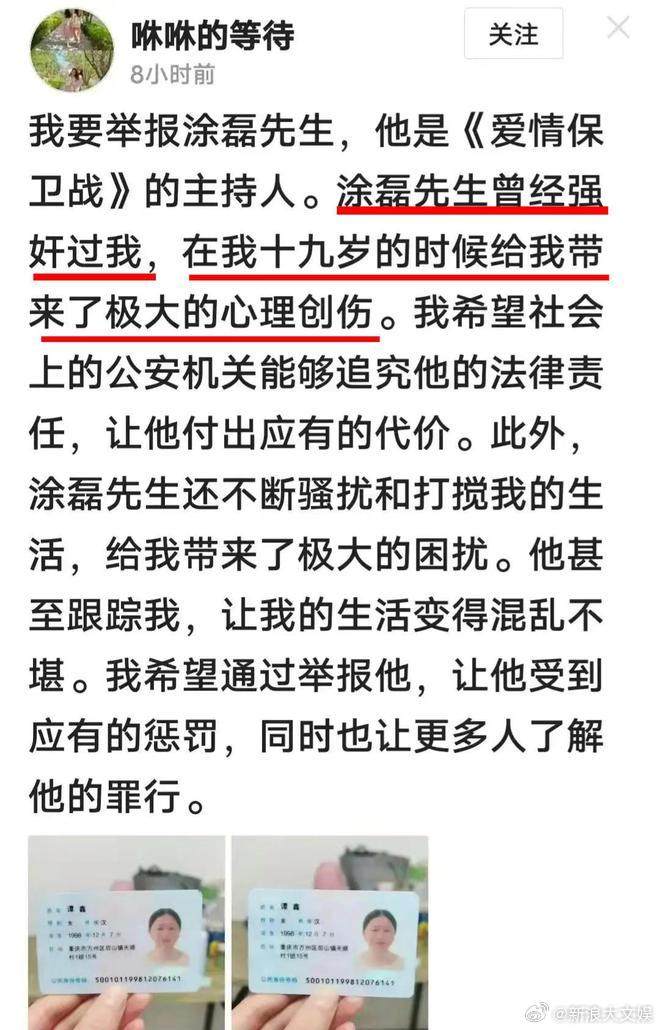 此前,“谭鑫”在网上实名举报被主持人涂磊强奸,她表示那年她只有19岁,涂磊的行为给其带来巨大的心理创伤。