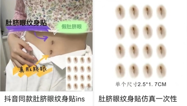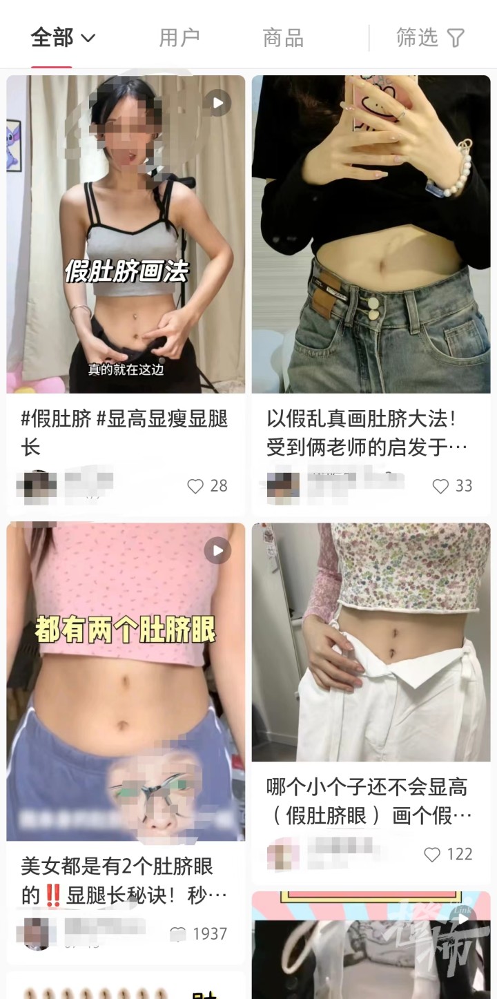 在某书平台上搜索“假肚脐眼”,能看到这个小东西的主要作用有2个,一是提高腰线位置,从视觉上打造大长腿和黄金比例,二是可以防止受凉,通过假肚脐眼实现露脐装,原本容易受凉的小腹位置则是被裤子包裹。