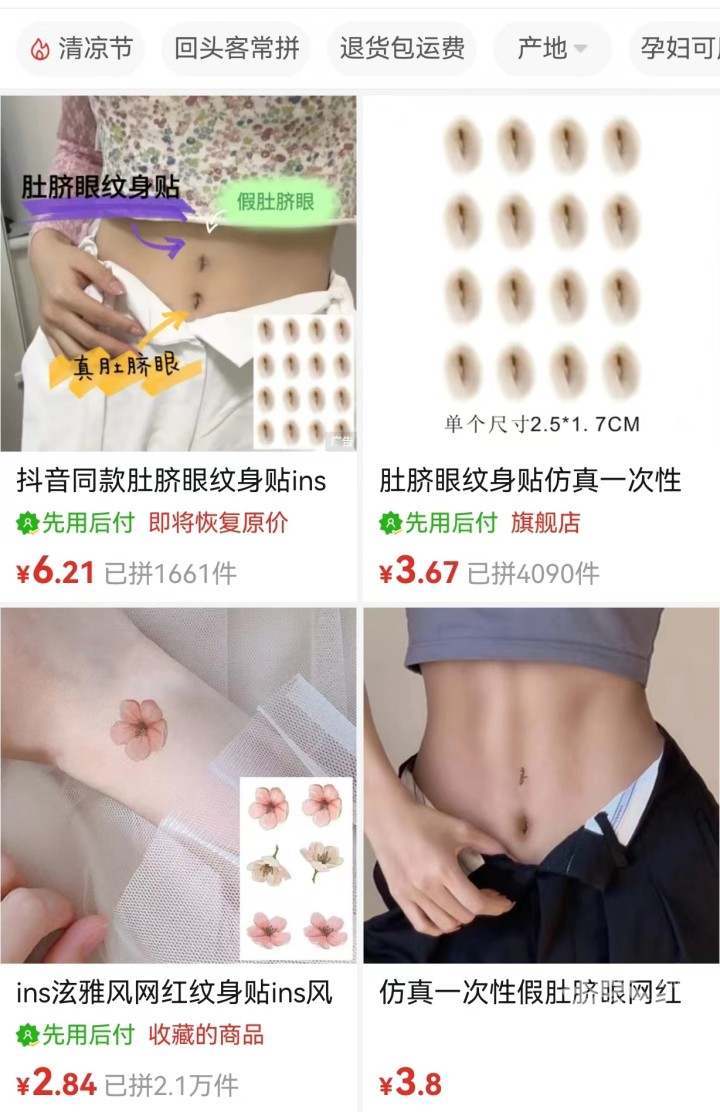 而假肚脐眼贴本身的价格也不高,几元就能买到一大堆,而且在某多和某宝上销量也相当不错,售卖的店家很多,最高的一家卖出了4000多单,看来有需求的妹子还真不少。
