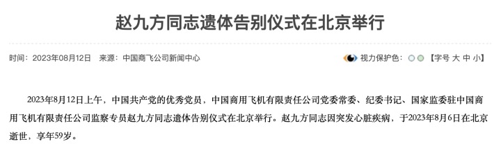 随后,中国商飞官网发布讣告称,2023年8月12日上午,中国共产党的优秀党员,中国商用飞机有限责任公司党委常委、纪委书记、国家监委驻中国商用飞机有限责任公司监察专员赵九方同志遗体告别仪式在北京举行。赵九方同志因突发心脏疾病,于2023年8月6日在北京逝世,享年59岁。