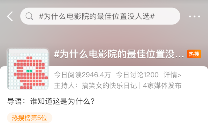 在电影购票选座时,用虚线框起来的中间排座位是官方推荐的“最佳观影区”,正对大屏幕,距离适中、视野清晰。曾经这块区域是大家买票的首选,现在为什么很多人不选了?
