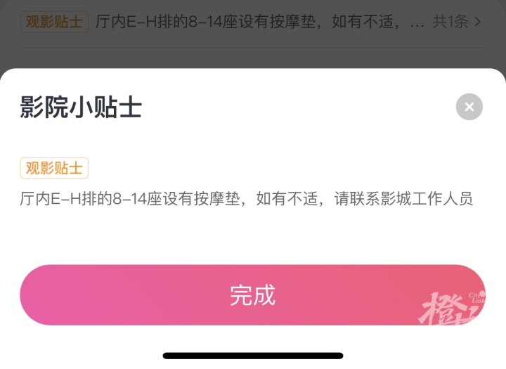 页面的观影贴士显示,“影院E-H座的8-14座设有按摩垫,如有不适,请联系影城工作人员。”