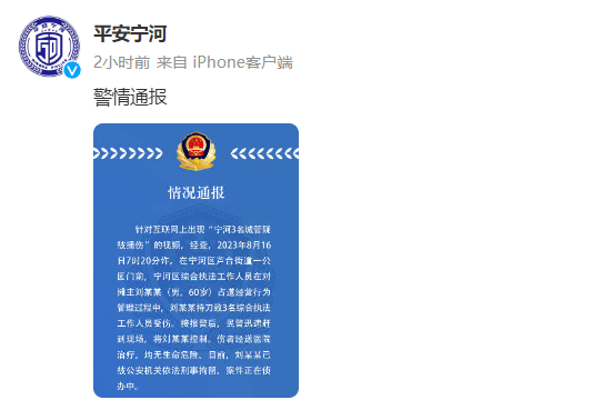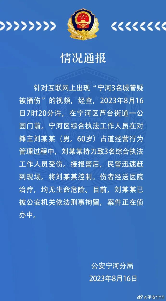 针对互联网上出现“宁河3名城管疑被捅伤”的视频,经查,2023年8月16日7时20分许,在宁河区芦台街道一公园门前,宁河区综合执法工作人员在对摊主刘某某(男,60岁)占道经营行为管理过程中,刘某某持刀致3名综合执法工作人员受伤。接报警后,民警迅速赶到现场,将刘某某控制。伤者经送医院治疗,均无生命危险。目前,刘某某已被公安机关依法刑事拘留,案件正在侦办中。