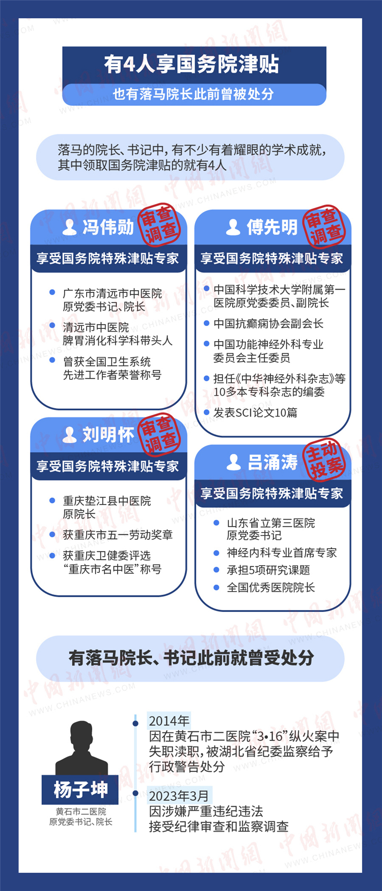 中新网注意到,也有落马院长、书记此前就曾受处分。3月21日,黄石市二医院原党委书记、院长杨子坤因涉嫌严重违纪违法,正接受纪律审查和监察调查。据媒体2014年9月报道,7名干部因在黄石市二医院“3·16”纵火案中失职渎职被追责。其中,湖北省纪委监察给予黄石市二医院党委书记、院长杨子坤行政警告处分。