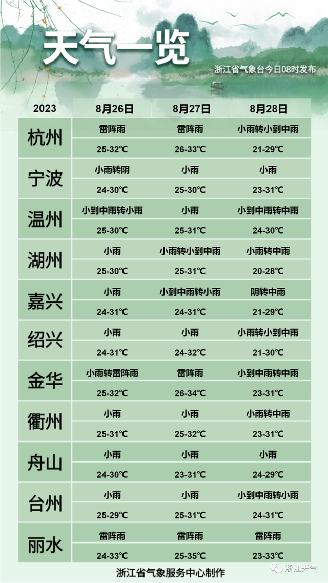 8月28日:浙北地区阴有阵雨或雷雨,部分中到大雨;浙中南地区多云到阴部分有阵雨或雷雨。