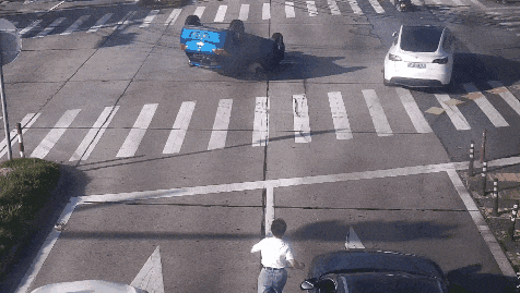 近日清晨,浙江嘉盐线张大线路口,一辆蓝色轿车不慎撞上前方让行的车辆后,失控侧翻在马路中央。接下去的一分钟,太燃了!