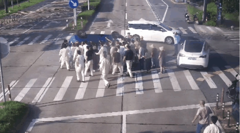 这时,后方的车内冲出两人,迅速跑到侧翻车辆边施救。