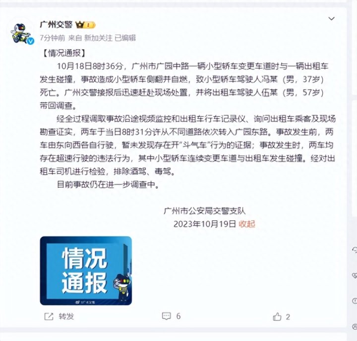 刚刚,广州交警通报宝马与出租碰撞起火详情: