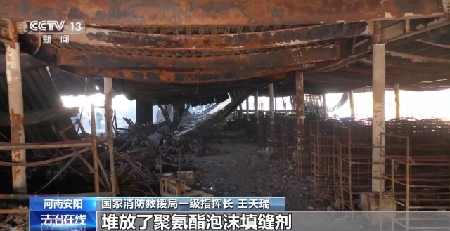 国家消防救援局一级指挥长 王天瑞:经过调查组的调查认定,这起特别重大火灾事故是由于企业的老板在没有任何防护、没有任何培训,在没有取得焊工证的情况下,冒险作业、违章电焊。高温的电焊火花掉落在货架上的聚氨酯泡沫缝剂货物上面,先是引燃了货物的纸质的外包装,最后造成了聚氨酯泡沫缝剂爆炸燃烧。