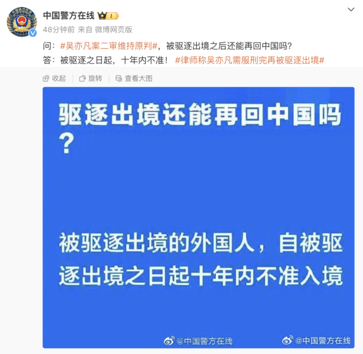 问:吴亦凡案二审维持原判,被驱逐出境之后还能再回中国吗?