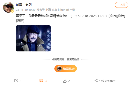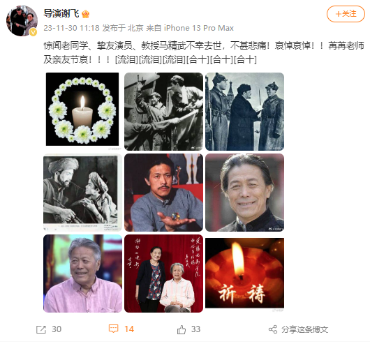 上海电影家协会副主席、上海戏剧学院教授、博士生导师石川@前海一支剑 、@导演谢飞等发文悼念。