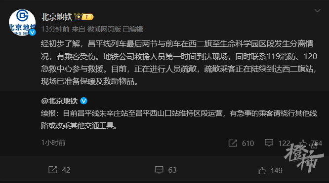 14日晚9时29分北京交通发布称:18:57,地铁昌平线西二旗站-生命科学园站上行区段一列车车厢脱离,迫停区间。事故发生后,应急、消防、卫健、交通等救援力量立即响应,到达现场,迅速开展救援。目前已发现30余人受伤,无人员死亡,伤员正陆续送往医院治疗,现场正在积极处置。事故原因正在调查中。