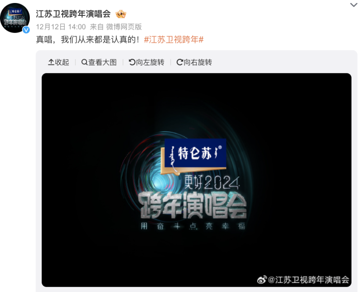今年受假唱风波的影响,12月12日,江苏卫视就喊出口号:“真唱,我们从来都是认真的!”
