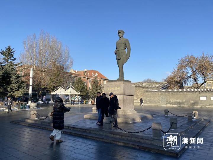 游客在沈阳张氏帅府张学良雕像前合影。 记者 陈黎明 摄