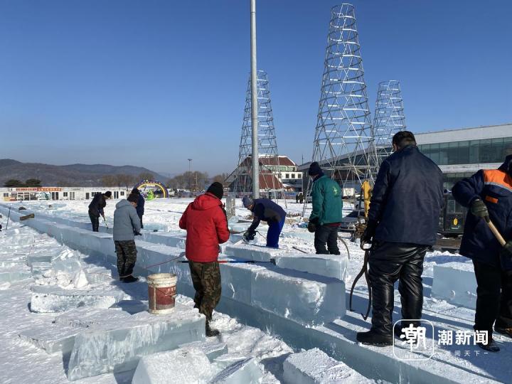 棋盘山冰雪大世界正在抓紧建设冰道。这些冰块均从不远处的秀湖采集而来,冰雪融化之后再流回秀湖,循环利用,既节水又环保。 记者 陈黎明 摄