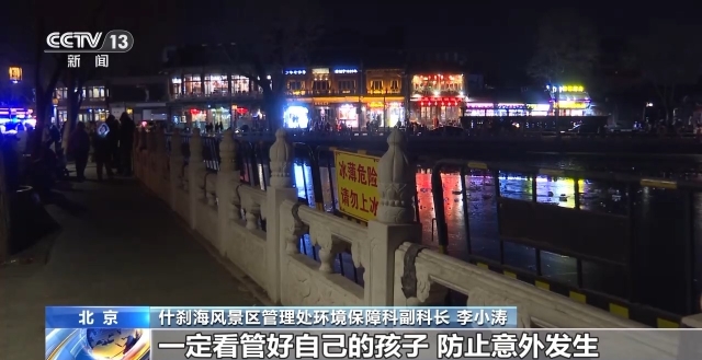 什刹海风景区管理处环境保障科副科长 李小涛:针对下午的儿童落水事件,紧急上了一下物理隔离措施,防止游客翻越过去。我们呼吁广大游客及市民朋友,请到正规的冰场游玩,因为冰场的工作人员每天会三次验冰,厚度达到15cm以上,才会正常开冰,呼吁家长朋友一定看管好自己的孩子,防止意外发生。