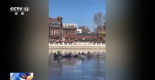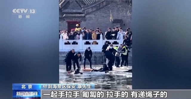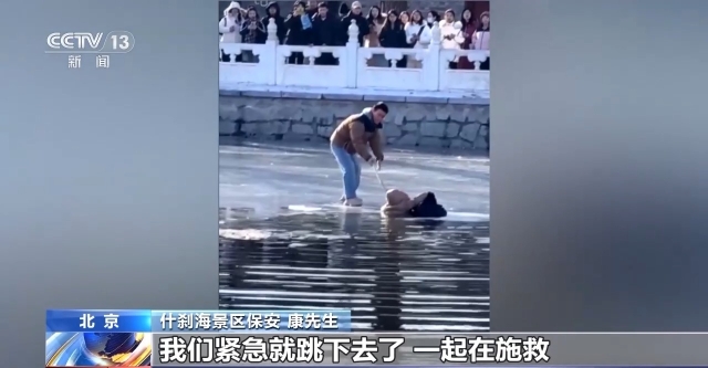 什刹海景区保安 康先生:那个冰厚度不是特别厚,而且还往水那边有点小斜坡。我们尽量让落水者第一时间上来,比较急,后期有好多人加入到救人当中,一起手拉手,匍匐的,拉手的,有递绳子的,热心市民递围巾的,一起把落水者救上来了。