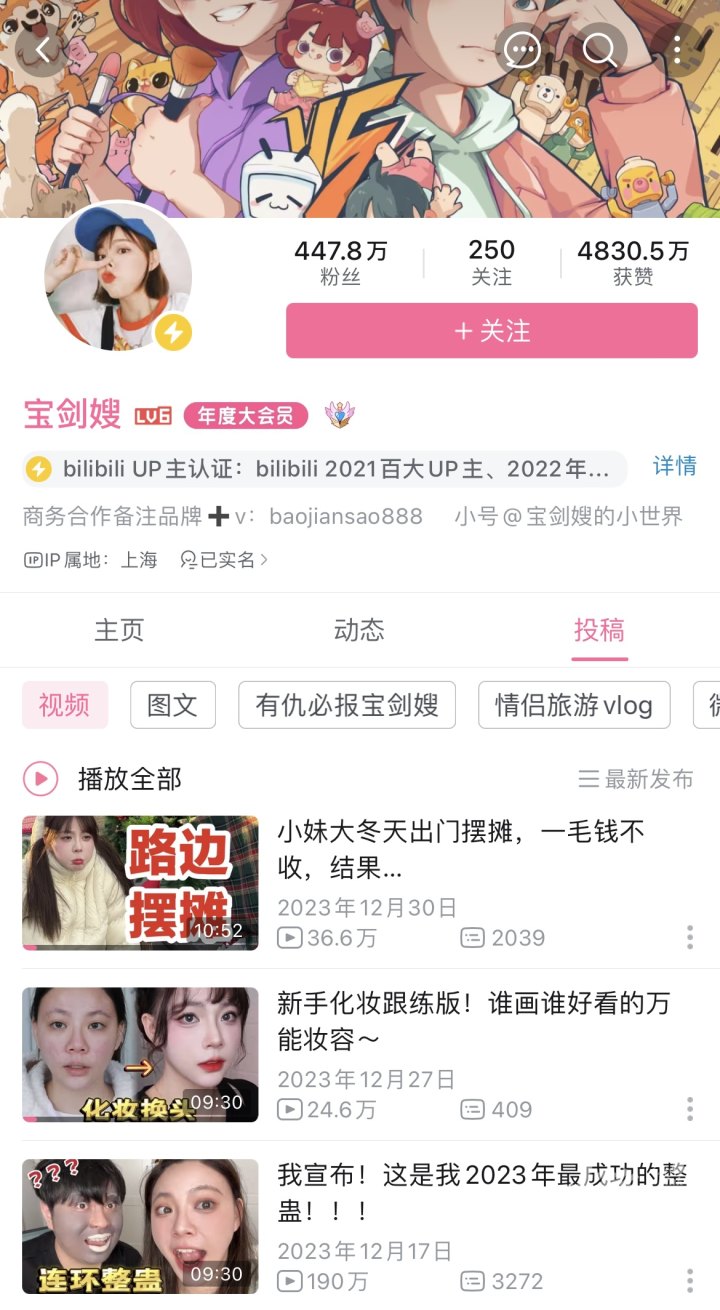 这是宝剑嫂第三次入选B站百大up主。作为一个美妆博主,她的每条视频都以“大家好,这里是努力在说标准普通话的宝剑嫂”开场。2017年,宝剑嫂在大学宿舍的床铺上拍摄上传了第一个美妆视频,展示自己从素颜到妆后的全过程。