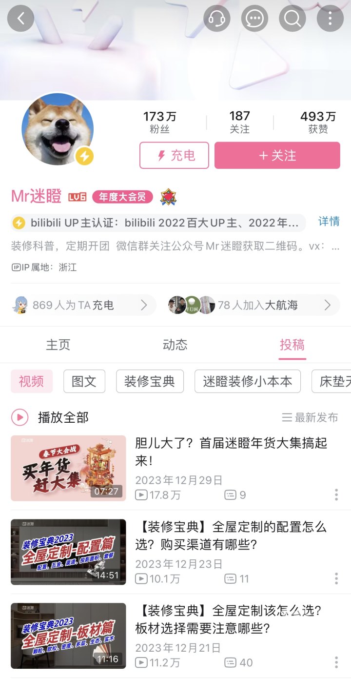 在B站,迷瞪被很多人称为“装修界的明灯”。从2020年开始做UP主以来,迷瞪一直以视频帮助普通人解决在装修过程中遇到的问题,从施工到建材,从家具到家装都能给出专业建议,前期视频更多以科普装修知识、帮看报价单等为主。