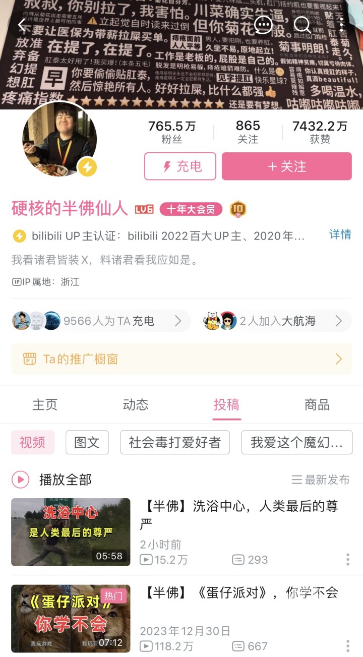 从中年人话题三件套“房、车、股票”到00后的游戏和追星,他的吐槽扫射各个年龄层。值得一提的是,半佛仙人的产出频率基本保持在每周更新2-3条视频,让网友感叹此人仿佛没有创作瓶颈期。
