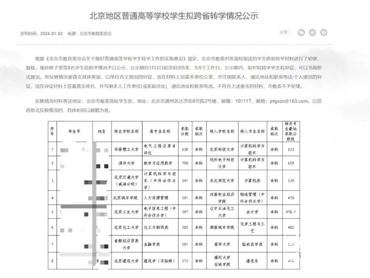 1月2日,北京市教育委员会官网发布一则公示,内容是北京地区普通高等学校学生拟跨省转学情况。其中,1人为转入、7人为转出,涉及清华大学、北京工业大学、北京建筑大学、首都经济贸易大学等多所高校。