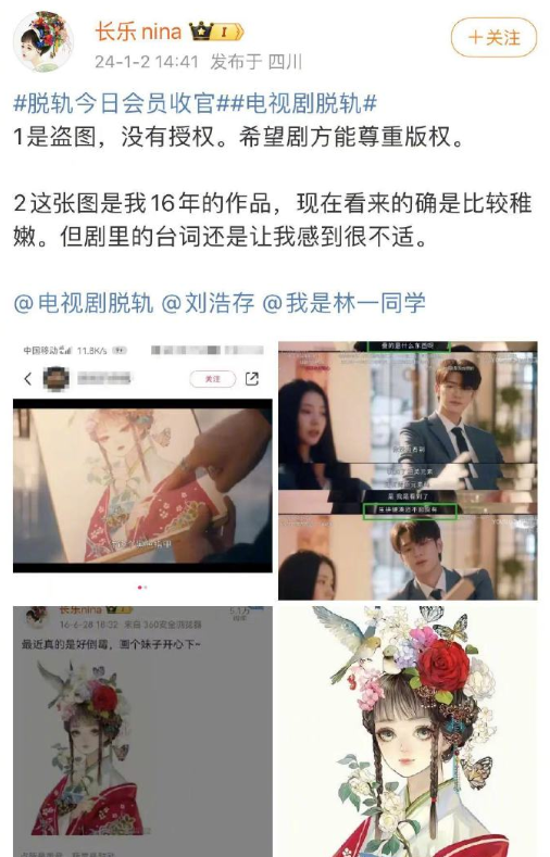 近日,博主“长乐nina”发文被电视剧《脱轨》盗图,希望剧方能尊重版权。博主称这张图是自己在2016年创作的画作,现在看来的确是比较稚嫩,不仅未经许可在剧中露面,而剧中角色的台词对画作指指点点,让人深感不适。