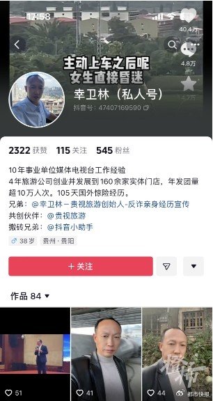 社交媒体上,幸卫林相关的抖音账号有三个,其中粉丝数为40万的“幸卫林”账号(认证信息为:贵视旅游酒业创始人-缅电诈亲历者),最近一次更新是在12月10日,视频内容显示幸卫林在某个签约仪式上。截至今天,已有一个月没更新。