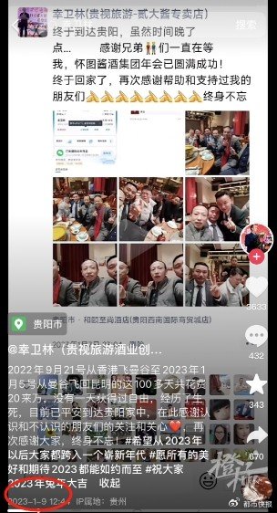 该账号2023年6月11日所发内容,幸卫林疑似站在“贵视旅游”门店前所拍,配文为:“做生意诚信第一,我已到岗在线上班”。但记者拨打该门牌上显示电话,对方称不认识幸卫林,该电话所在地显示为遵义。