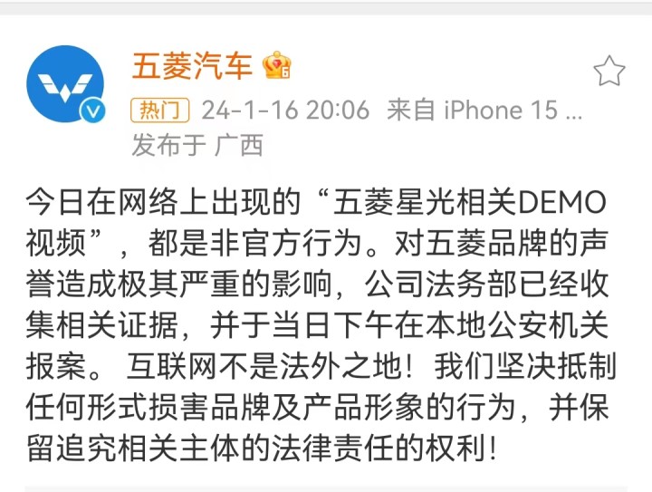 五菱汽车在官方声明中表示,网络上出现的“五菱星光相关DEMO视频”,都是非官方行为,“对五菱品牌的声誉造成极其严重的影响,公司法务部已经收集相关证据,并于当日下午在本地公安机关报案。”