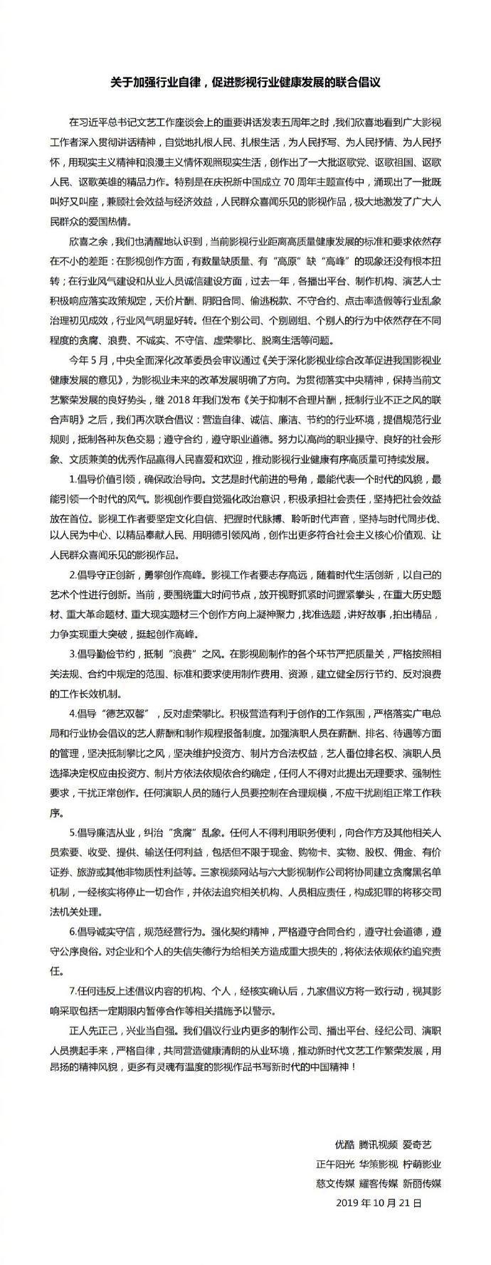 为了避免娱乐圈的争番、攀比等乱象,业界公司曾联合发布自律倡议。2019年,优酷、腾讯视频、爱奇艺三家视频网站,联合正午阳光、华策影视、柠萌影业、慈文传媒、耀客传媒、新丽传媒六大影视制作公司,共同发布《关于加强行业自律,促进影视行业健康发展的联合倡议》。