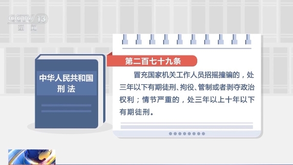 《中华人民共和国刑法》第二百七十九条规定,冒充国家机关工作人员招摇撞骗的,处三年以下有期徒刑、拘役、管制或者剥夺政治权利;情节严重的,处三年以上十年以下有期徒刑。