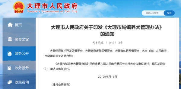 记者查阅发现,大理市曾在2019年发布了《大理市城镇养犬管理办法》。其中第十一条写道,养犬实行登记和强制免疫制度,未经免疫、登记任何单位和个人不得饲养犬只。同时,第三十一条也提到,未经登记擅自饲养犬类等宠物或者在建成区户外放犬类等宠物的,责令其改正;拒不改正的,处50元以上100元以下的罚款。