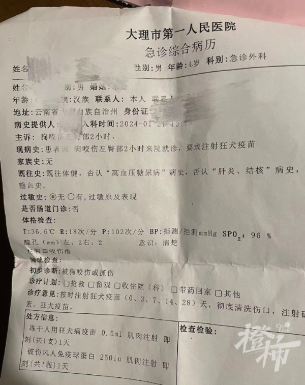 病历上写着,患者为男性,年龄4岁,入科时间是2024年1月23日下午1时53分,现病史为“患者因狗咬伤左臀部2小时来院就诊,要求注射狂犬疫苗”,医院给出的诊疗意见是“按时注射狂犬疫苗,彻底清洗伤口”等。
