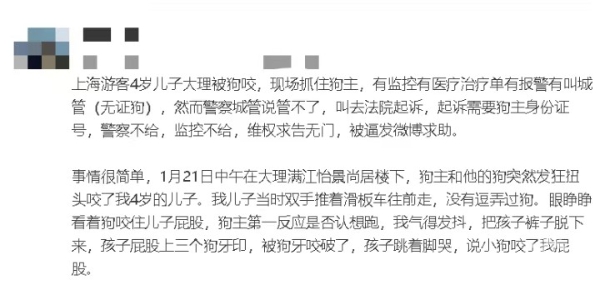 今天中午,一条“上海游客4岁儿子在大理被狗咬”的帖子在网上热传。