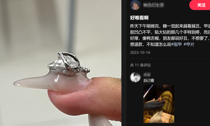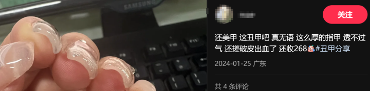 有美甲师在热门微博下留言:没有前置、没有建构、有阶梯、钻全包、ab点没包、甲型也没修好、所有雷点全踩了。