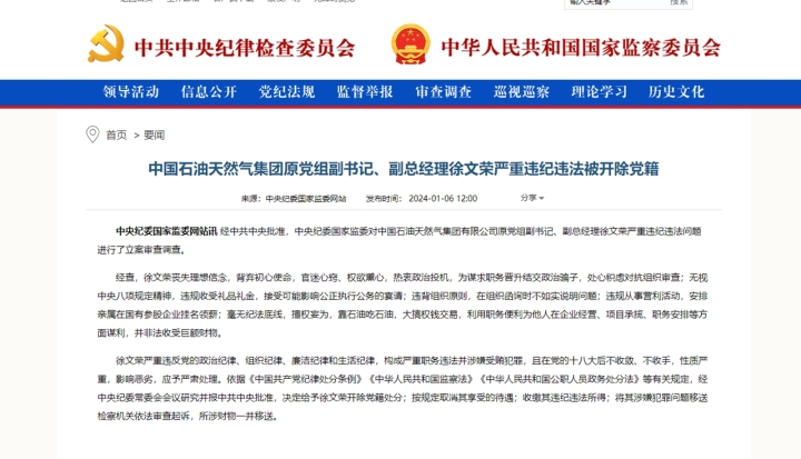 2024年1月6日,中央纪委国家监委网站发布消息称,中国石油天然气集团原党组副书记、副总经理徐文荣严重违纪违法被开除党籍。